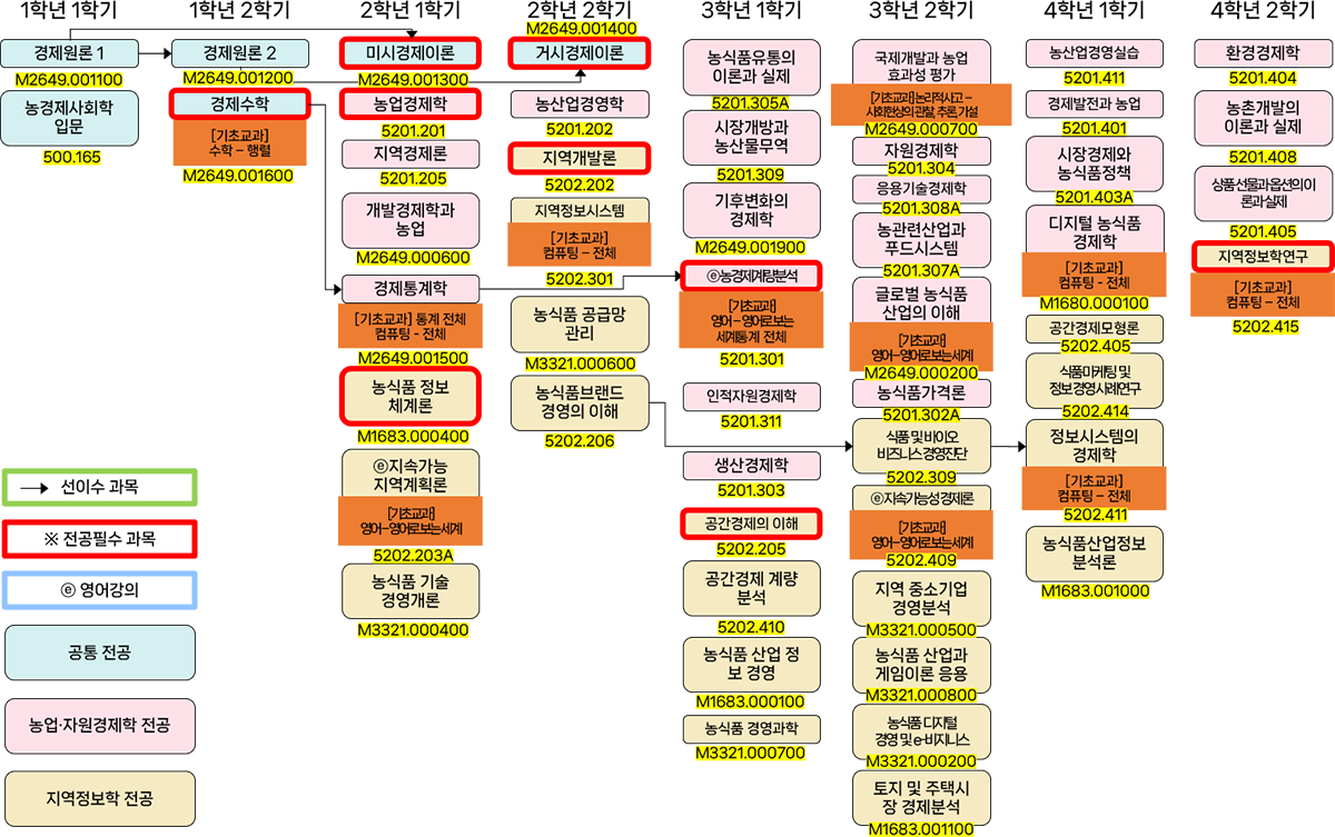 | 7 | 농경제계량분석 5201.301 | 통계 | 경제통계학이 선수과목으로 있는 것처럼 통계적 지식이 필히 요구되며, 그 과정에서 통계 전체 부분을 학습하고 오는 것이 필수적임. |