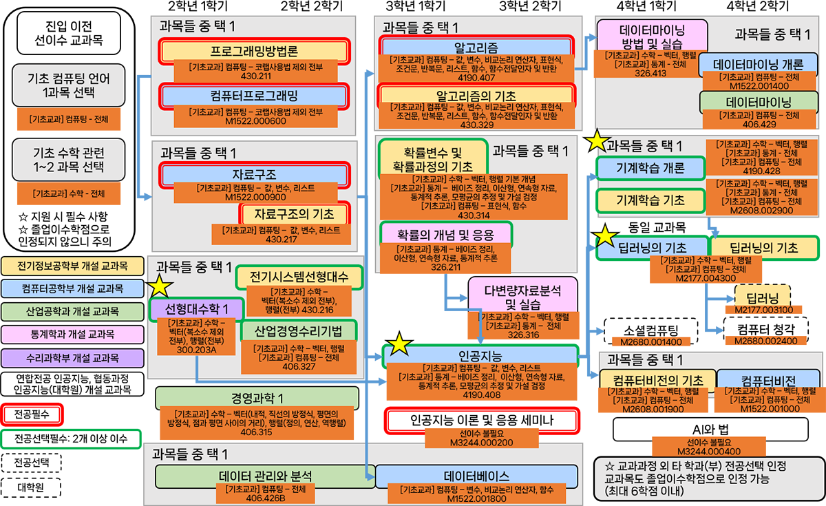 | 17 | 데이터마이닝방법 빛 실습 326.413 | 수학 (벡터, 행렬) 통계 | 통계학과에서 개설하는 데이터마이닝 관련 과목으로, 수학적, 통계적 접근이 필요하므로 관련 디딤돌 과목을 학습하시길 추천합니다. |