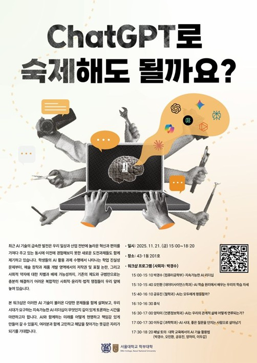 AI 시대, 교육이 나아가야 할 방향은?‘ChatGPT로 숙제해도 될까요?’ 워크숍 포스터 지난 11월 21일, 서울대학교 학부대학은 43-1동 201호에서 'ChatGPT로 숙제해도 될까요?'를 주제로 워크숍을 개최했다. 최근 생성형 AI의 급속한 확산으로 대학 교육이 나아가야 할 방향에 대한 많은 논의가 있는 가운데, 다섯 명의 교수가 각자의 전공 관점에서 교육의 미래를 논의하는 자리가 마련되었다. 특히 패널 토론 시간에 학생 참석자와 교수간 활발한 의견 공유가 돋보였다. AI로부터 배울 수 있는 학습 태도는? 오민환 교수의 ‘AI학습 원리에서 배우는 우리의 학습 자세’ 세션 첫 순서로 박경수 컴퓨터공학부 교수가 '지속가능한 AI 리더십'을 주제로 발표했다. 박 교수는 최근 과제 점수는 높지만 시험 점수는 낮은 학생들이 증가하고 있는 현상을 지적하며, AI 활용이 성취도 평가에 미치는 영향을 제기했다. 이어 데이터사이언스학과 오민환 교수는 AI 학습 원리를 인간의 학습에 접목하는 흥미로운 관점을 보여줬다. 오 교수는 보상을 최대화하는 행동을 학습하는 강화학습 알고리즘 중 하나로, ‘지금 이 순간’ 보상을 최대화하는 방향을 선택하는 ‘그리디 알고리즘(Greedy Algorithm)’을 설명했다. 일반적인 경우에는 그리디 알고리즘이 보상을 최대화할 것 같지만, 예상과는 다르게 멀리 떨어진 곳에 보상이 있을 것이라고 예측하고 그곳까지 가서 보상을 확인해 보는 ‘낙관적 알고리즘’이 가장 효율적이다. 보상이 있을지 없을지도 모르는데 있을 것이라고 낙관적으로 예측하고 가 보기 때문에 낙관적 알고리즘이라는 이름이 붙었다. "그리디 알고리즘보다 낙관적 알고리즘이 가장 효율적이듯, 인간도 학습을 할 때 효율성보다는 낙관적인 기대를 가지고 접근해야 하지 않을까?"라며 AI 알고리즘에서 배울 수 있는 학습 태도를 강조했다. AI속 숨겨진 불평등 공유진 교수의 ‘AI는 모두에게 평등할까?’ 세션 워크숍에서는 AI속 숨겨진 평등과 불평등 문제도 고찰했다. 철학과 공유진 교수는 'AI는 모두에게 평등할까?'라는 질문을 던지며 AI의 사회적 편향 문제를 다뤘는데, 재범 예측 알고리즘에서 흑인의 오류율이 백인에 비해 2배 높게 나타나는 등 AI가 기존 사회의 차별을 강화하고 있다는 점을 지적했다. 또 공 교수는 자원의 평등한 분배를 다루는 분배적 평등만 생각해서는 AI의 불공정성을 해결하기 어렵다고 강조하며, 관계적 평등의 관점을 제시했다. "유튜브의 퀴어 콘텐츠 제한 알고리즘은 단순히 자원 분배의 문제가 아니라, 특정 집단의 목소리를 지우고 동등한 사람임을 부정하는 관계적 불평등의 문제"라고 설명했다. 질의응답에선 "AI는 데이터를 통해 학습하기 때문에 인간의 삶을 반영한다. 그렇다면 그 전에 인간의 삶 속 불평등을 먼저 해결해야 하는 것이 아닌가?"라는 인상깊은 질문이 있었다. 공 교수는 "편향성이 모델 개발자의 고의가 아니더라도 개발자와 사회 전반이 책임을 져야 한다"며 "데이터 수집 과정에서부터 편향성이 최대한 제거되도록 다양한 집단의 참여가 필요하다"고 답했다. AI가 연 더 자유로운 학습의 가능성과 대학 교육 이두갑 교수의 ‘AI 시대, 좋은 질문을 던지는 사람으로 살아남기’ 세션 과학학과 이두갑 교수는 조금 더 긍정적인 차원에서 AI를 바라보며 ‘AI시대, 좋은 질문을 던지는 사람으로 살아남기’라는 주제를 다뤘다. 이 교수는 "학점으로 모든 것이 환원되는 현 대학 교육 시스템이 교육의 가능성을 축소시킨다"고 지적하며, 인간으로부터 배울 때는 다양한 압박감과 의무로부터 시달리며 학습하지만, AI는 사회적 의무나 압박감으로부터 자유로운 탐색과 실험을 가능하게 한다는 긍정적인 관점도 보여줬다. 패널 토론(왼쪽부터 박경수, 오민환, 공유진, 양차미, 이두갑 교수) 워크숍 후반부에는 다섯 명의 교수와 참석자들이 함께 참여한 패널 토의가 진행되었다. 수업에서 AI 가이드라인에 관한 질문에 각 교수는 자신만의 대응 방식을 공유했다. 공유진 교수는 "수업시간에 토론을 적극 활용한다. 전통적 글쓰기를 통해 얻을 수 있는 것도 많고, 철학 수업에서는 글쓰기가 필수적일 때도 많지만, 우선은 수업 내 토론으로 최대한 참여를 이끌어내려고 한다"고 말했다. 양차미 교수는 보다 낙관적인 입장을 보였다. "서울대 학생들은 학습 의욕이 있으므로 가이드라인이 명확하다면 괜찮을 것"이라며 다만 AI가 너무나 쉽게 할 수 있는 단순 서평과 같은 글쓰기 과제를 부여하지 않고, 과제에 체험, 토론, 사유의 요소를 도입하고 이를 평가하는 방식으로 수업을 디자인한다고 설명했다. AI 사용에 대한 학생들의 목소리 이어져 토의에서는 학생들의 생생한 경험도 공유됐다. 한 학생은 "자신과 주변 사람들 대부분이 과제에서 AI를 사용하고 있다"며 "그러다 보니 자기가 하고 싶은 공부만 하게 되는 문제가 생긴다. 필수 교양 등의 존재 의미가 점점 희미해지고 있다"고 우려했다. AI 활용이 학생들의 학습 범위를 오히려 좁힐 수 있다는 지적이었다. 반면 다른 학생은 새로운 관점을 제시했다. AI를 사용할 수 있고 답지를 베낄 수도 있었지만 직접 숙제를 했었던 자신의 경험을 나눴다. 